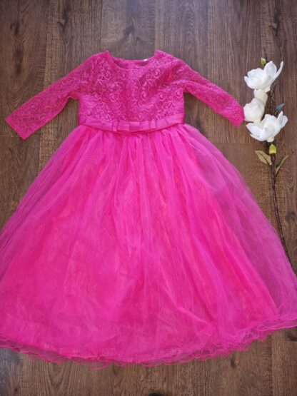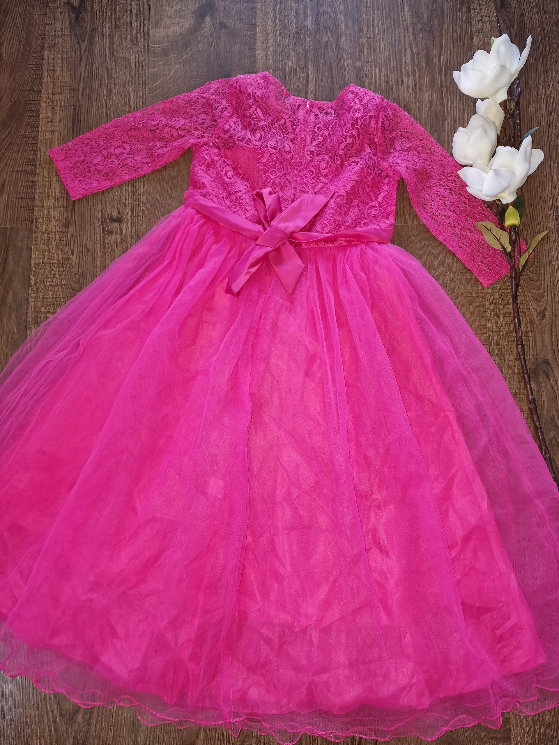 140es beleírt méretű, kb 134-140-es méretre való csodaszép pink csipkés tüllös alkalmi vagy koszorúslány ruha. Egyetlen alkalmat viselt újszerű állapotú. Abroncs nincs hozzá, anélkül volt viselve.